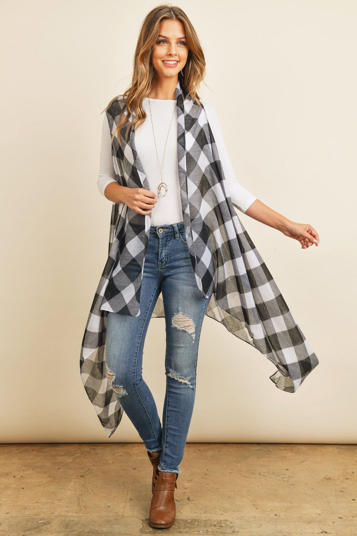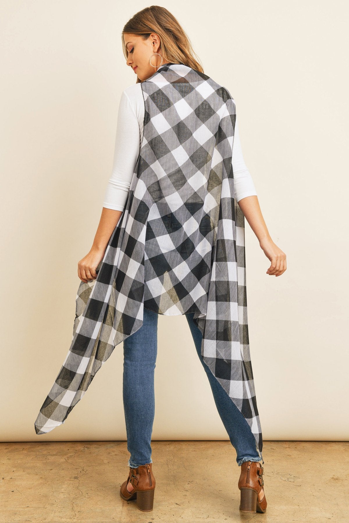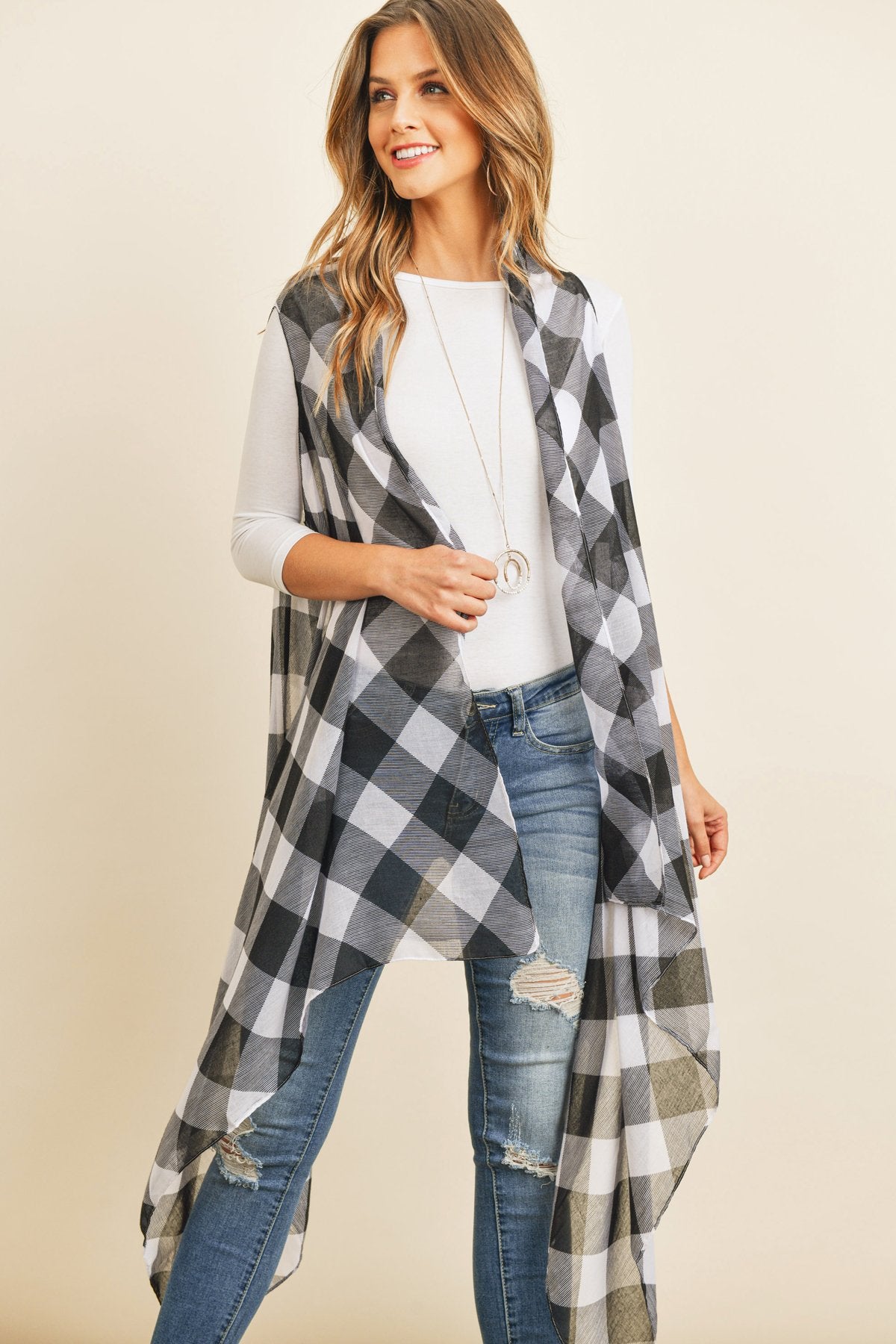 This light-weight kimono and vest are sure to instantly spice up an otherwise simple outfit. They're finished in a beautiful, all-over plaid print in red or white backgrounds for a vibrant pop and made from a soft breathable fabric, offering a flattering comfortable fit. They feature an open-front and a flowy silhouette for easy-breezy movement.
