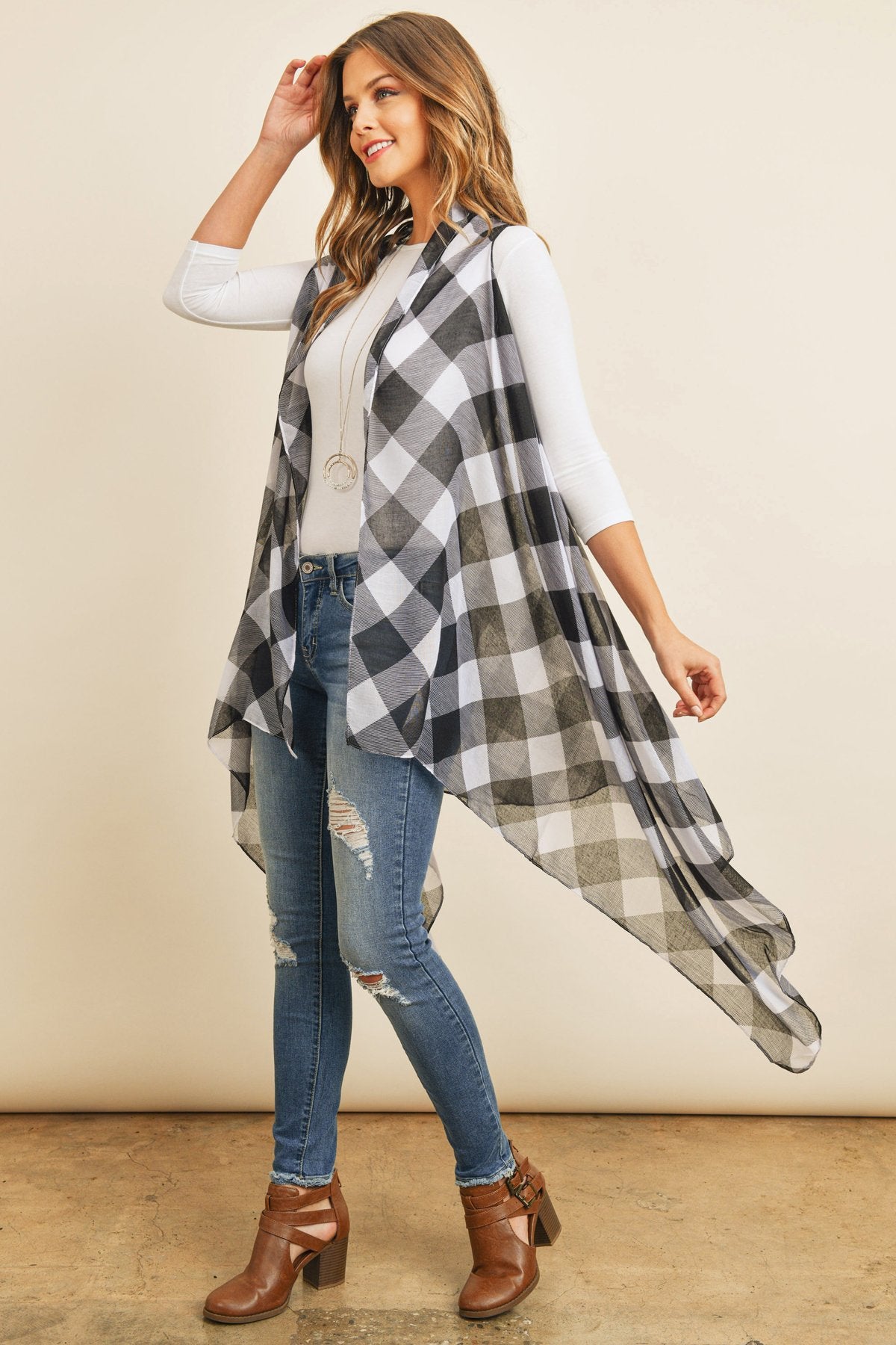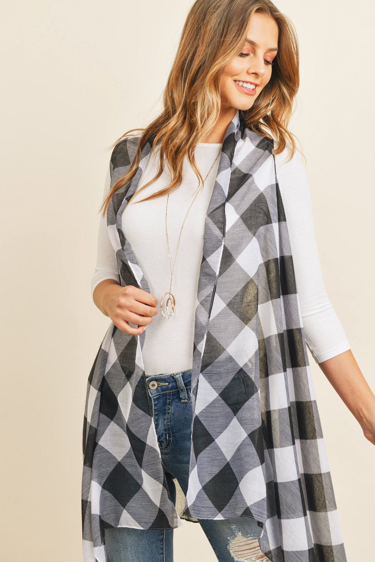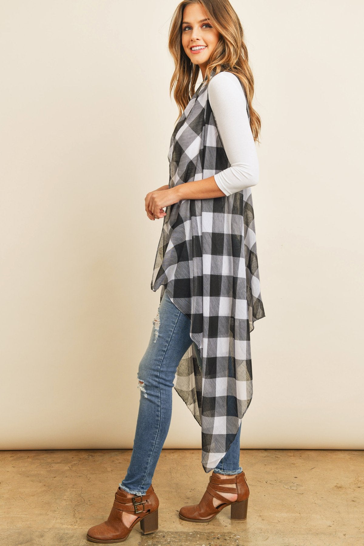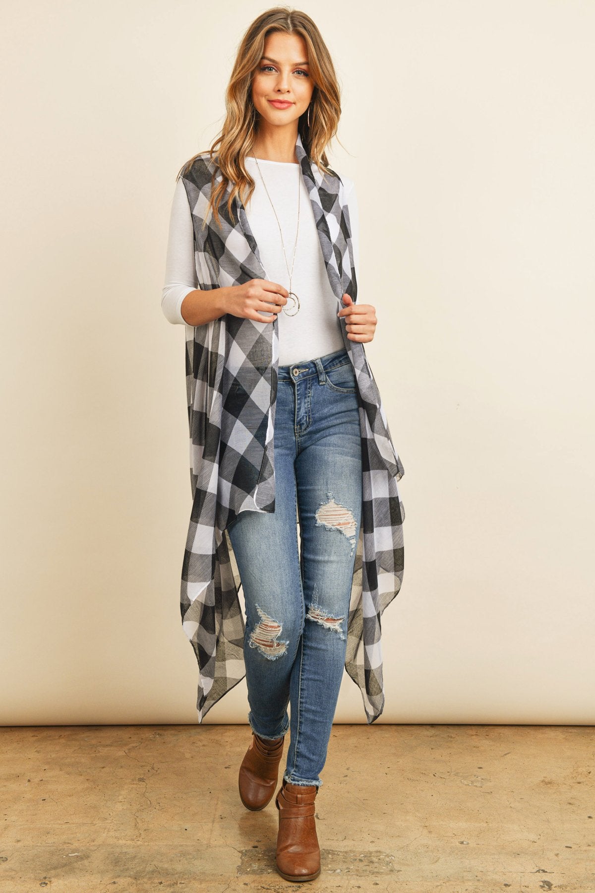 This light-weight kimono and vest are sure to instantly spice up an otherwise simple outfit. They're finished in a beautiful, all-over plaid print in red or white backgrounds for a vibrant pop and made from a soft breathable fabric, offering a flattering comfortable fit. They feature an open-front and a flowy silhouette for easy-breezy movement.