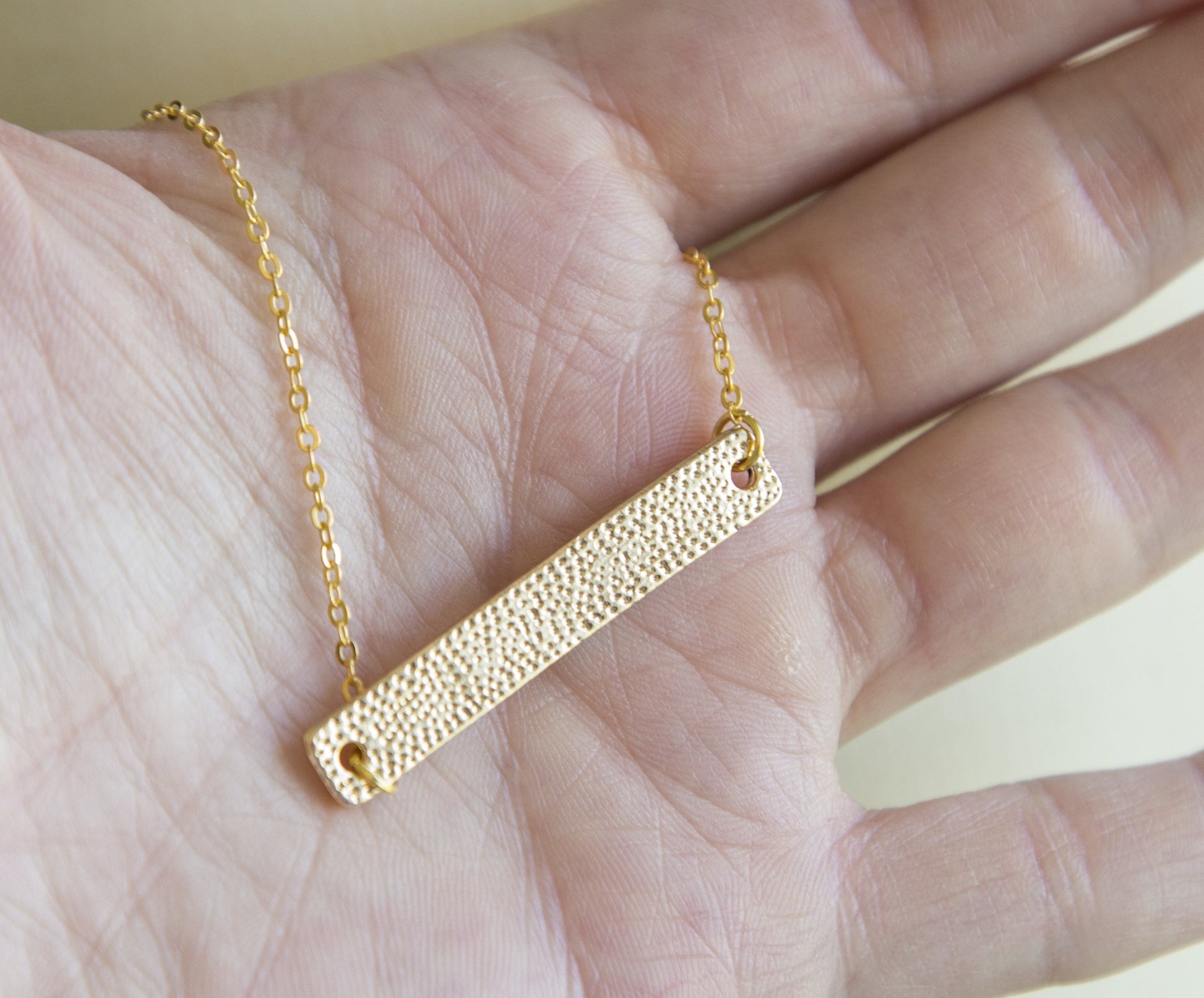 The necklace is 45cm long, gold plated, the bar 6mm x 35mm, gold plated. You can buy it with gold plated chain or gold filled chain and clasp.
