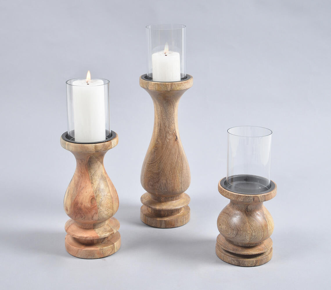 Natural Mango Wood & Glass Pillar Candle Holders (Set of 3)