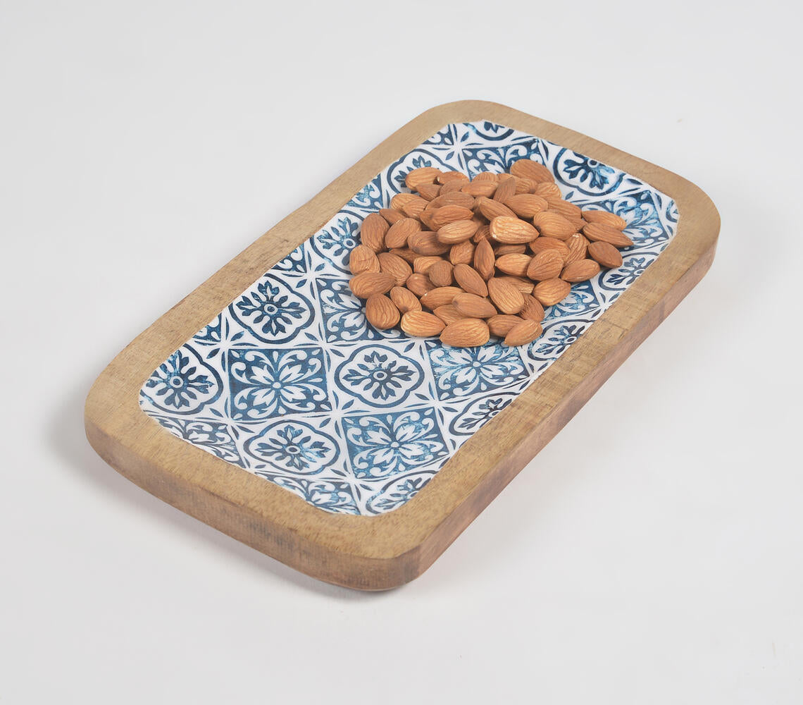 Striking a rare balance between traditional decor themes and class design, this meena print blue wooden tray can accentuate the aesthetic of any dining space! The wooden offering is all about making your food look good with a combination of hues and patterns that are familiar and yet make the dishes stand out! Donning diligent artistry, it has been designd by skilled Indian artisans. So, each design choice is carefully picked and executed by master craftsmen, giving these rather fundamental patterns an aesthetic that cannot possibly be replicated by anybody in the world. Blown away by its understated elegance and nuanced design voice, Q bazaar brings you this piece of serveware from its curated collection!