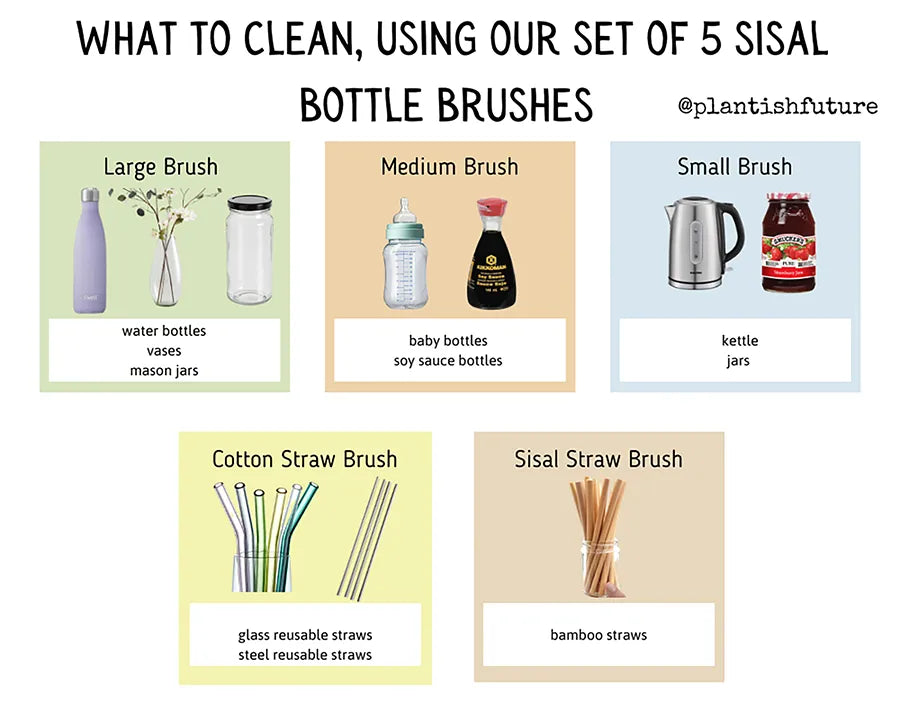 5 different sizes of plastic-free bottle brushes for all your cleaning (& recycling) needs!