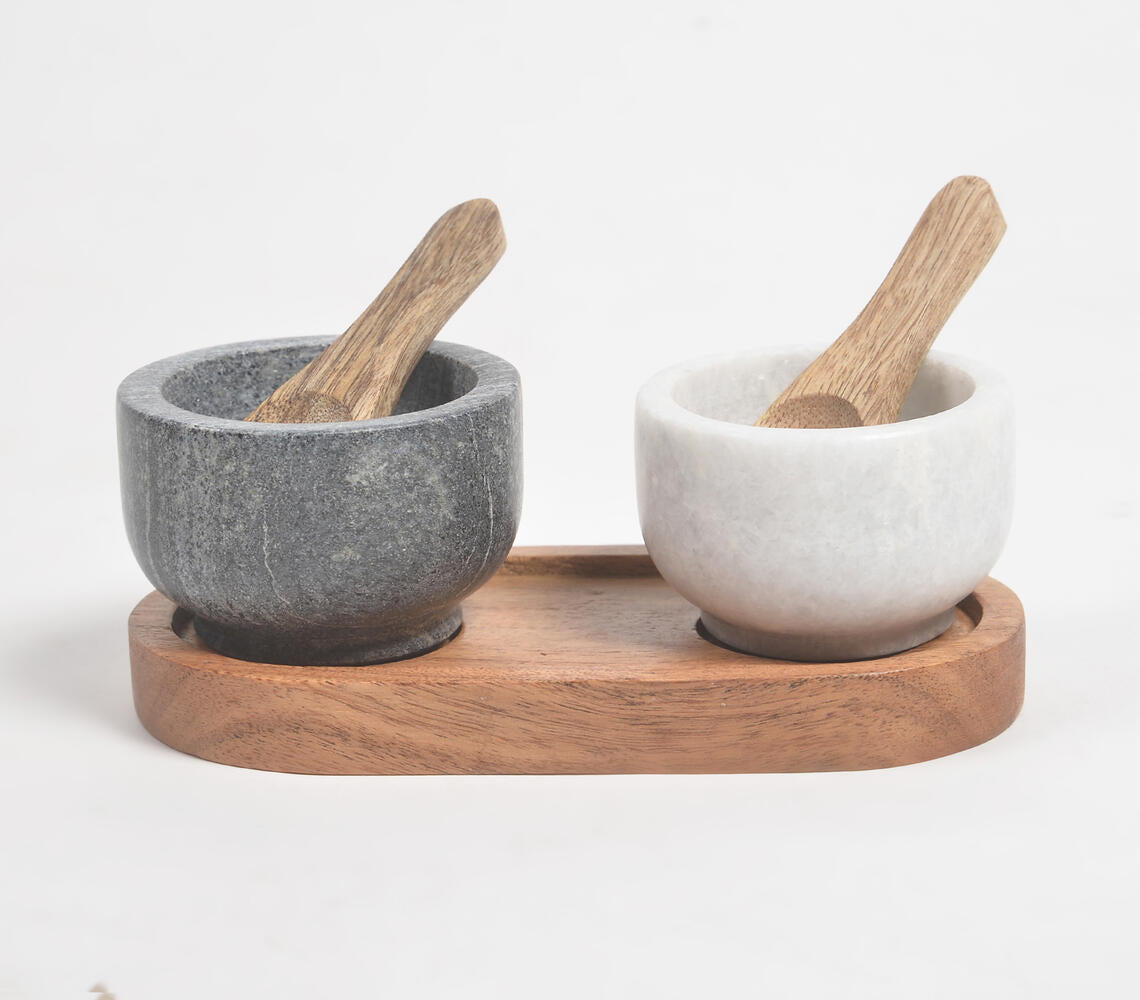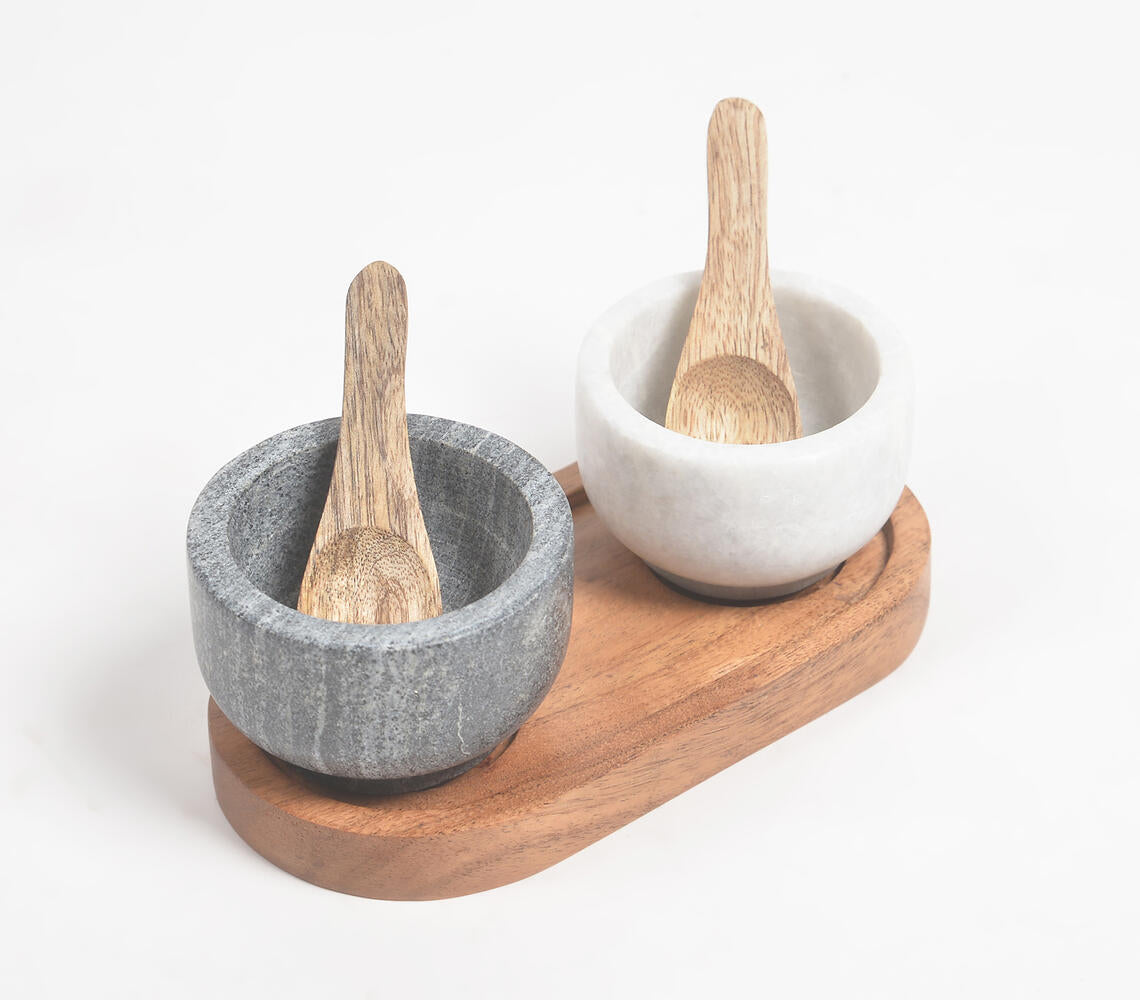 A kitchen must-have, this highly functional natural stone condiment set has been crafted by artisans using the stone turning technique. This set features a pair of wooden spoons and a wooden tray along with the twin bowls, to make serving condiments easier. Traditional meets contemporary in this unique, masterfully crafted offering that has been sculpted from polished stone. The craft of hand turning dates back eons. A skilled artisan fixes a rough-hewn circular block of stone at the head of the traditional lathe machine and hammers it in place by hand. The machine begins whirring as the artisan introduces a hand-held chisel to the block, and applies varying degrees of pressure to sculpt the desired shape and to smoothen the edges. The natural beauty of each material shines through in this set