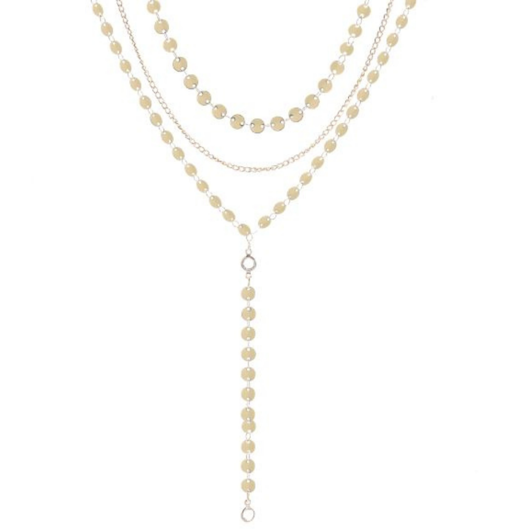 Delicate 3 strand necklace, including a lariat made with mini coin-shaped pieces.